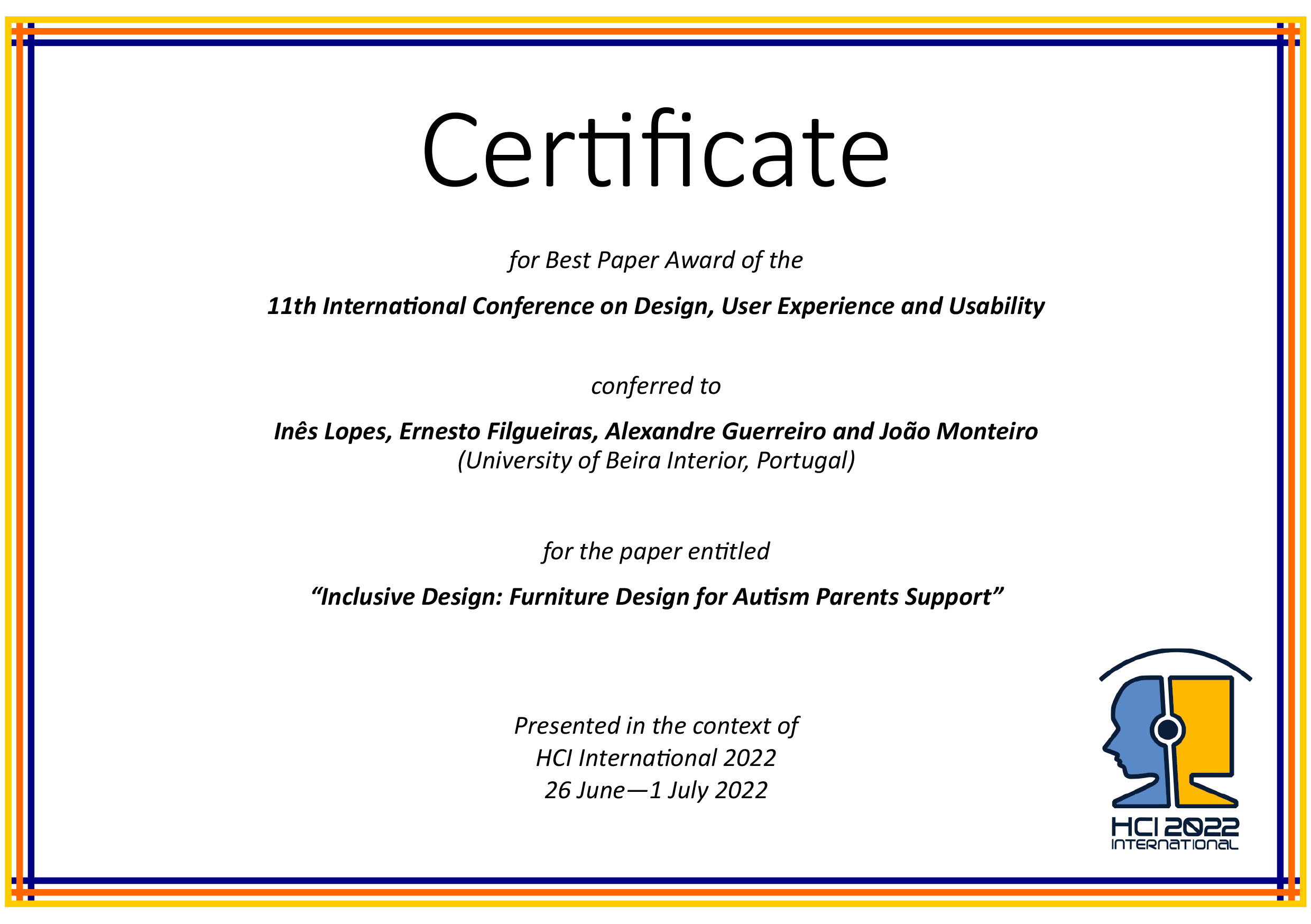 Prémio “best paper Award - HCI international 2022”